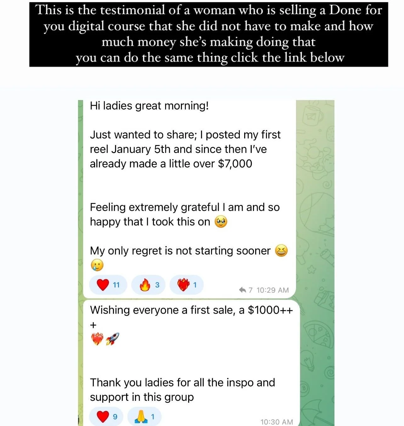 ✓ Access to a community of 10,000 + women selling the same thing so you won't be alone in this journey.