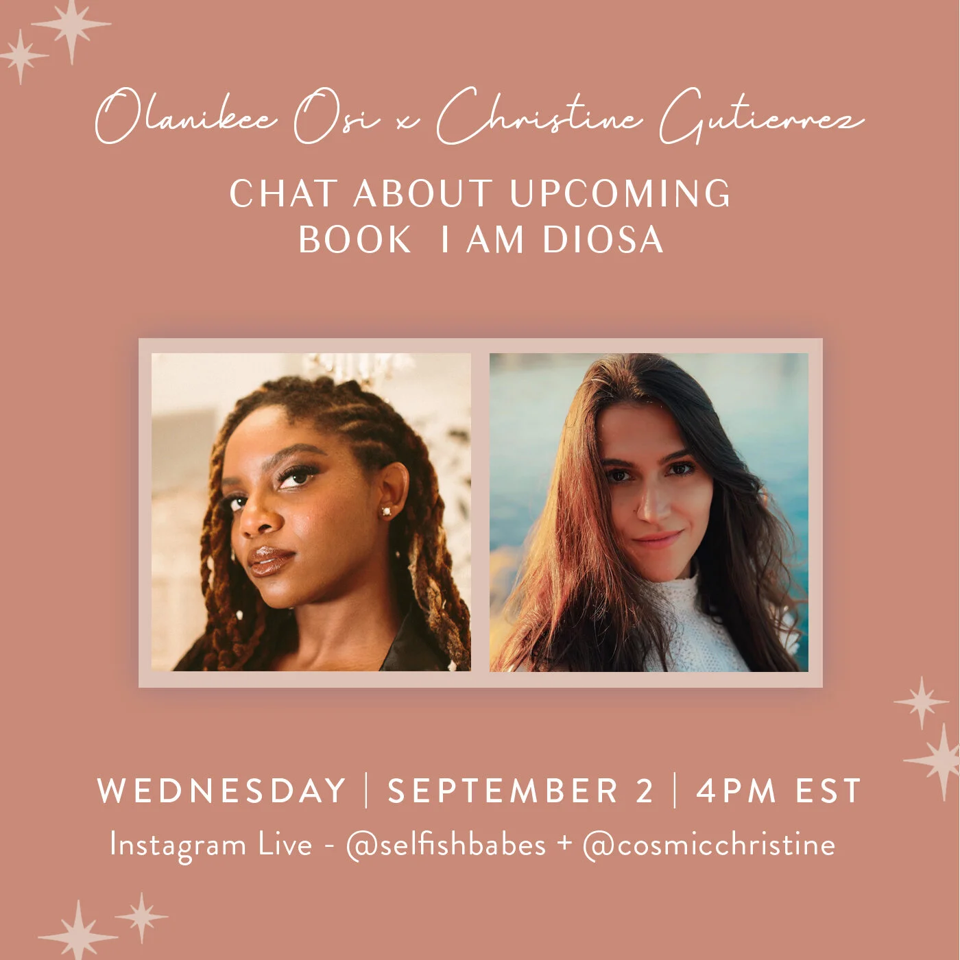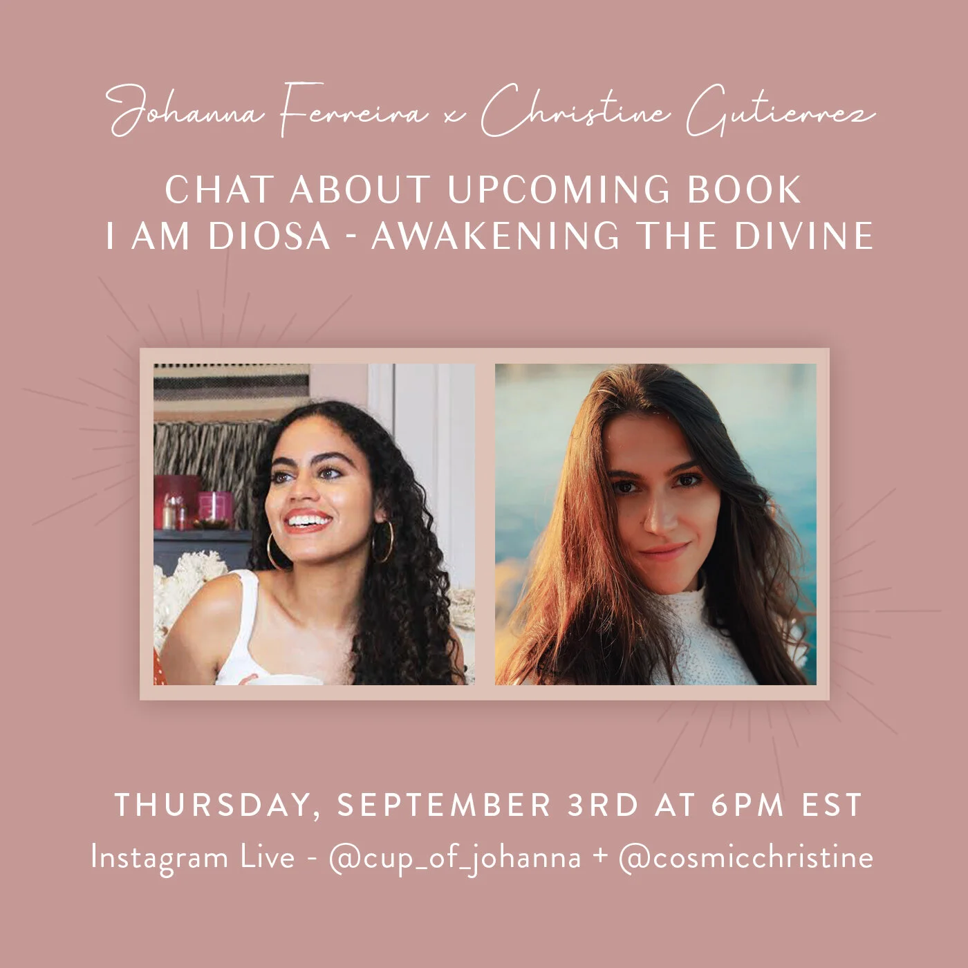 Join us as we chat about Christine’s book, I Am Diosa: A Journey to Healing Deep, Loving Yourself, and Coming Back Home to Soul via FB/IG Live. View the calendar to see all upcoming events and details. We look forward to seeing you there!